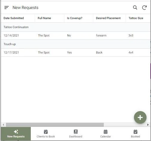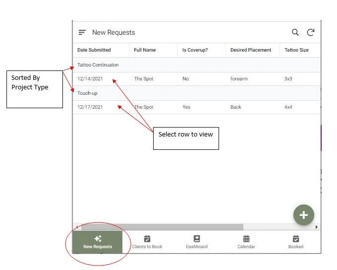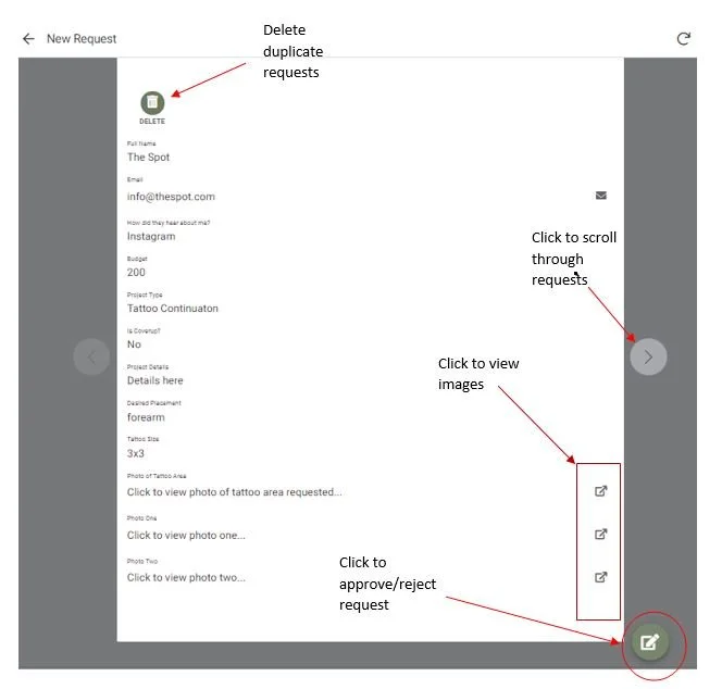 New Requests - This is where new requests come in from your Tattoo Request form. This is where The Artist reviews the submission and sets an approval status (Approved, Rejected, More Info Needed), Time Needed and other information related to the approval.