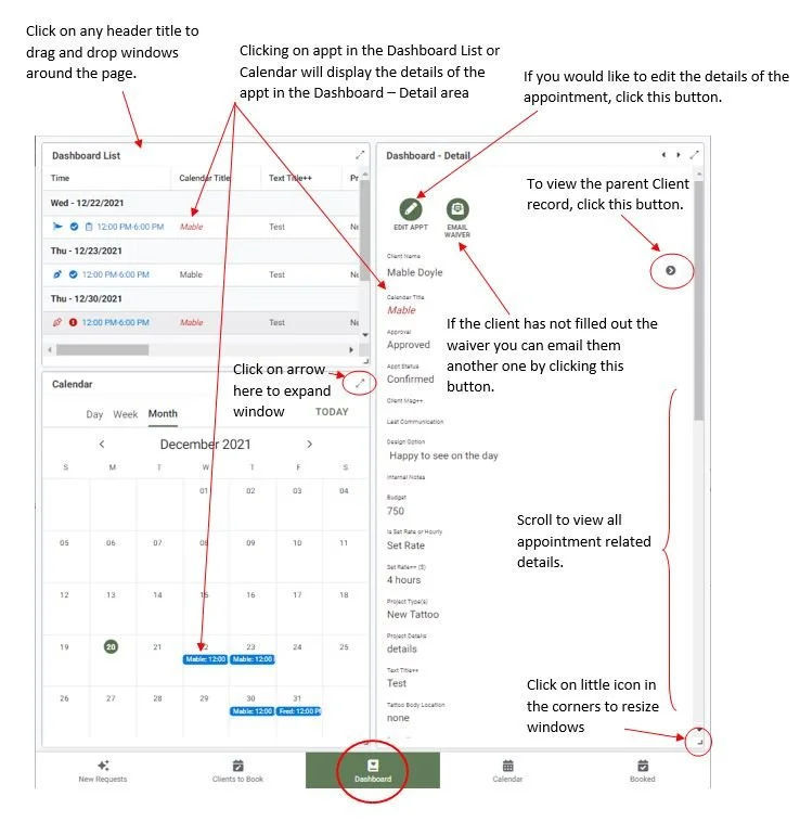 Dashboard - The is where multiple views are displayed. Best viewed on an iPad or computer. You will see all you upcoming appts listed in the top left, calendar in the bottom left and the details of whatever appt is selected from either the list or the calendar. Note that you can move the windows around by clicking on the title and drag and dropping. You can also resize the windows by clicking and holding the bottom right of each window and moving it.