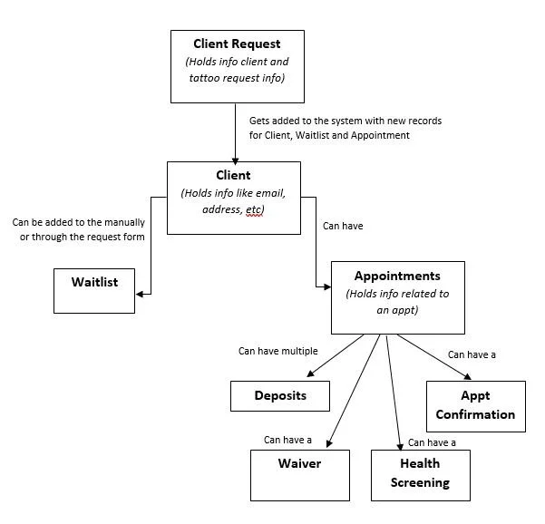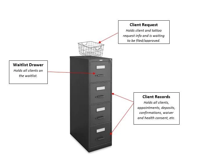 To give you an overview of the application you can visualize it as a filing cabinet. At the top of the filing cabinet, there are a bunch of folders that contain requests. An artist reviews each of the folder requests and then once reviewed they get filed. Each client's waitlist info gets added to the top Waitlist drawer and then they get their own drawer in the filing cabinet and inside that drawer, they have a folder for Appointments that hold information about the deposits, confirmations, and covid responses for that specific appointment.