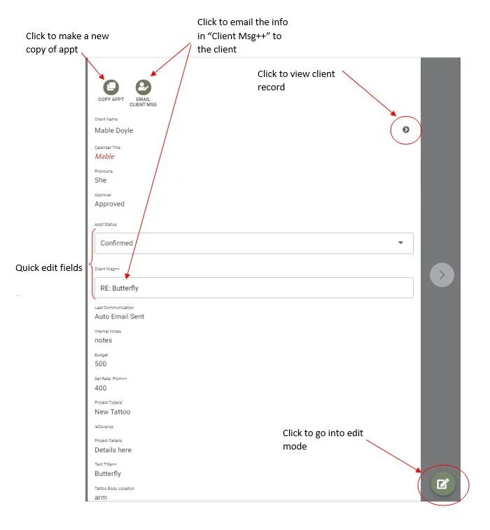 Email Client Msg - This is used to send whatever is in the Client Msg++ field to the client. Often this is used when booking to send follow-up info only. When clicked a copy of the email will be sent to you and then typically moved into the Reviewed folder.
