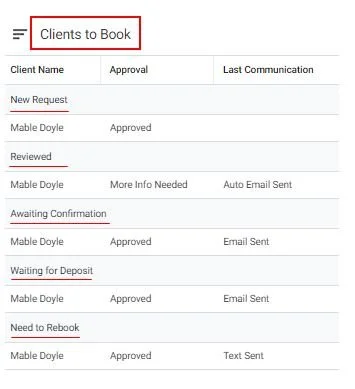 Clients to Book - This lists all the appointments that have been reviewed by The Artist and have been saved with an approval status. This list keeps track of all requests needing to be booked and where the scheduler with typically work from.